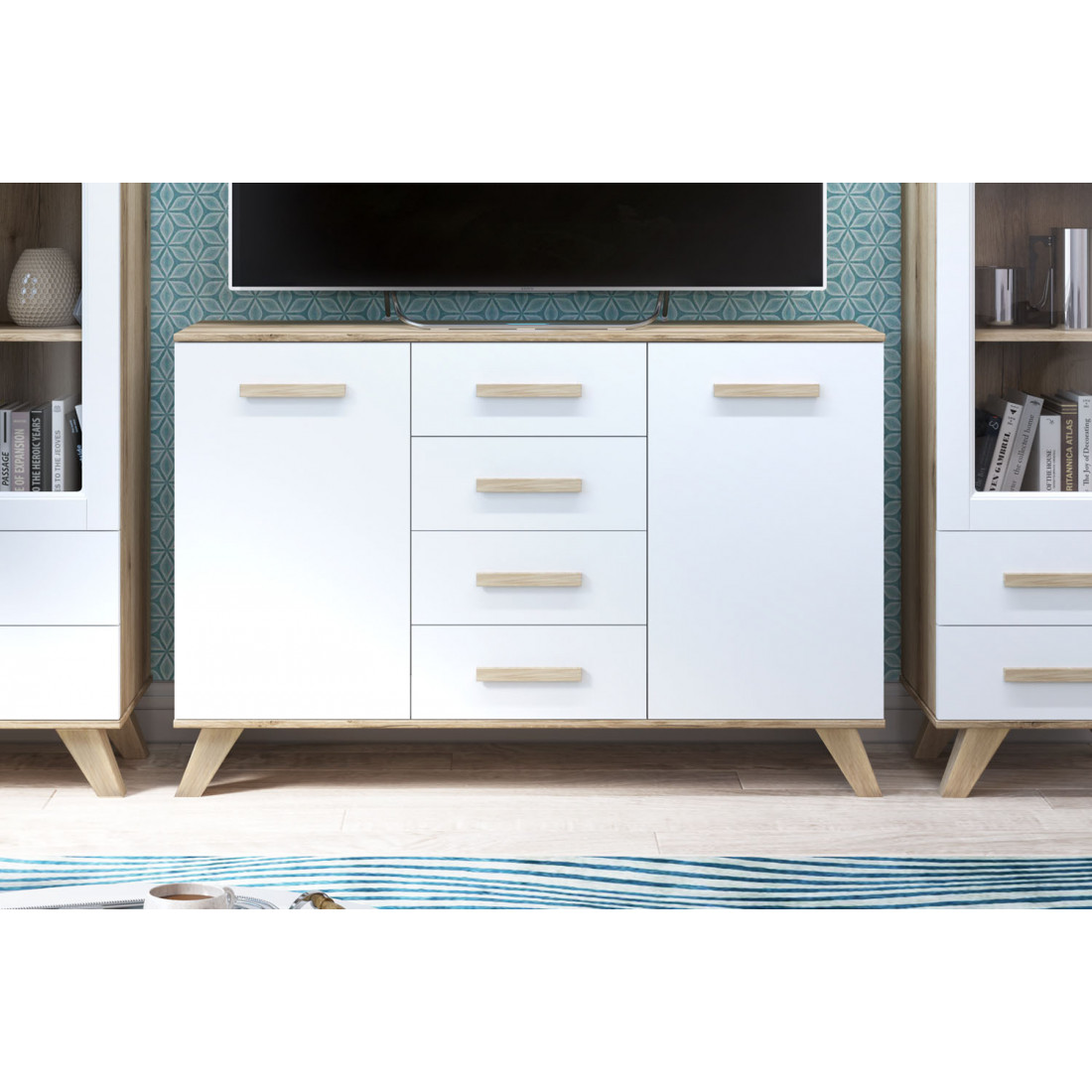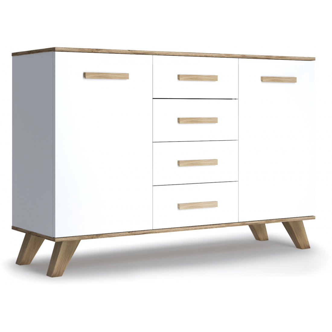 Большой комод серии «Вега Скандинавия» — комод для спальни или гостиной. Можно установить на него телевизор или вазами, рамочками с любимыми фото. хранения обеспечивают 4 выдвижных ящика, а также отделы с распашными дверцами.