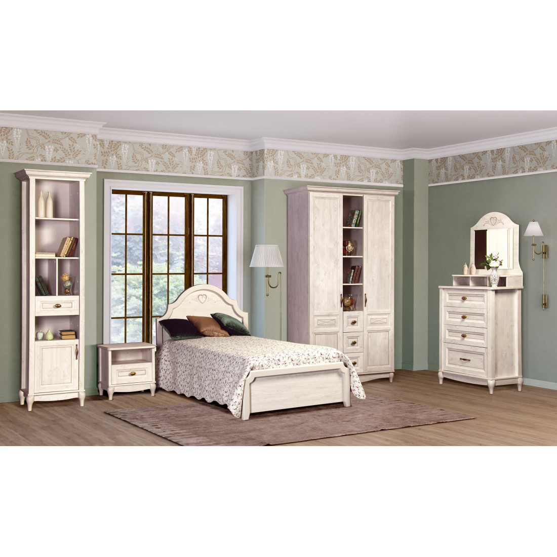 Корпус: ДСП, декор – сосна белая. Основание кровати – ламели