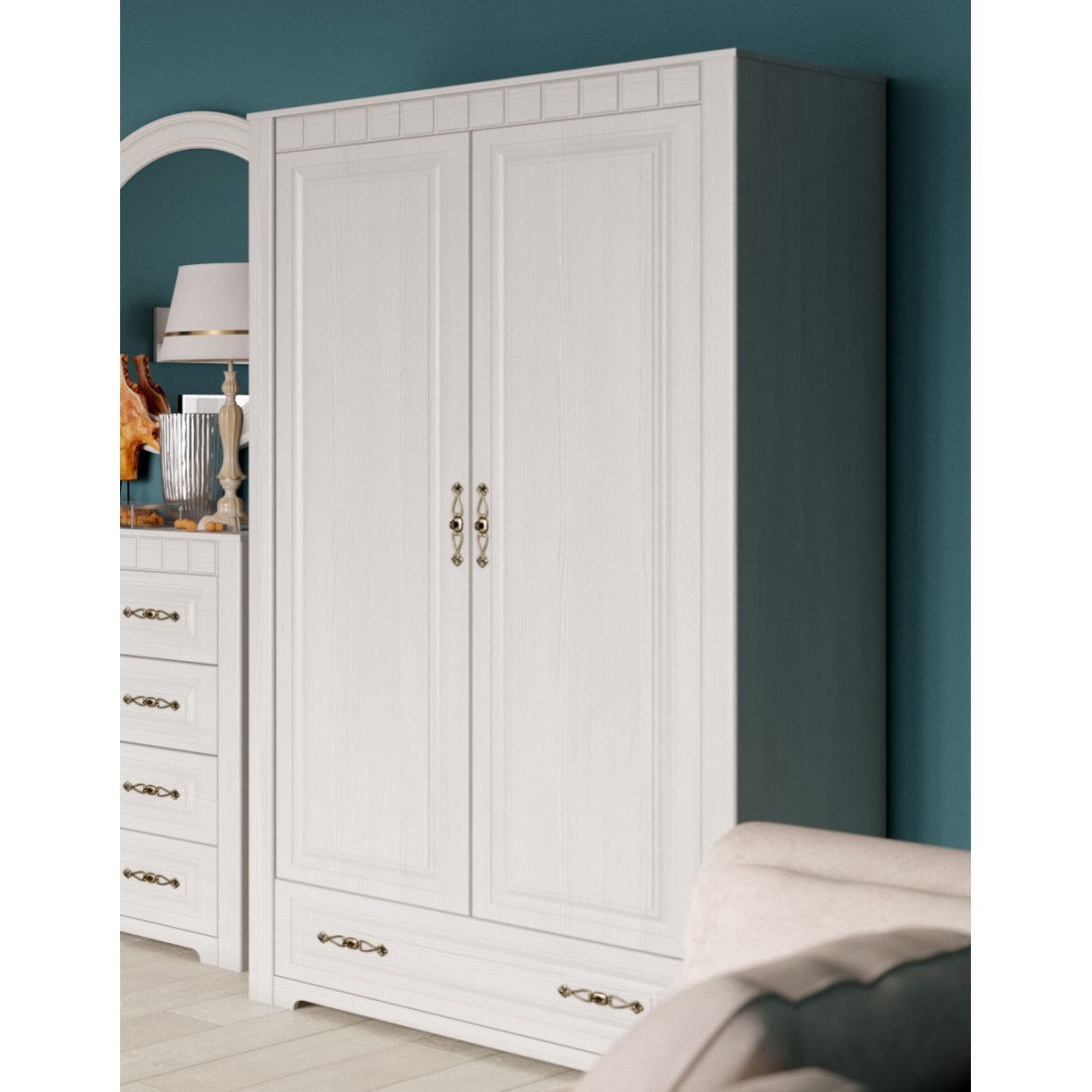 Шкаф 2-х дверный зеркальный Неаполь Ясень анкор светлый (патина "серебро")
