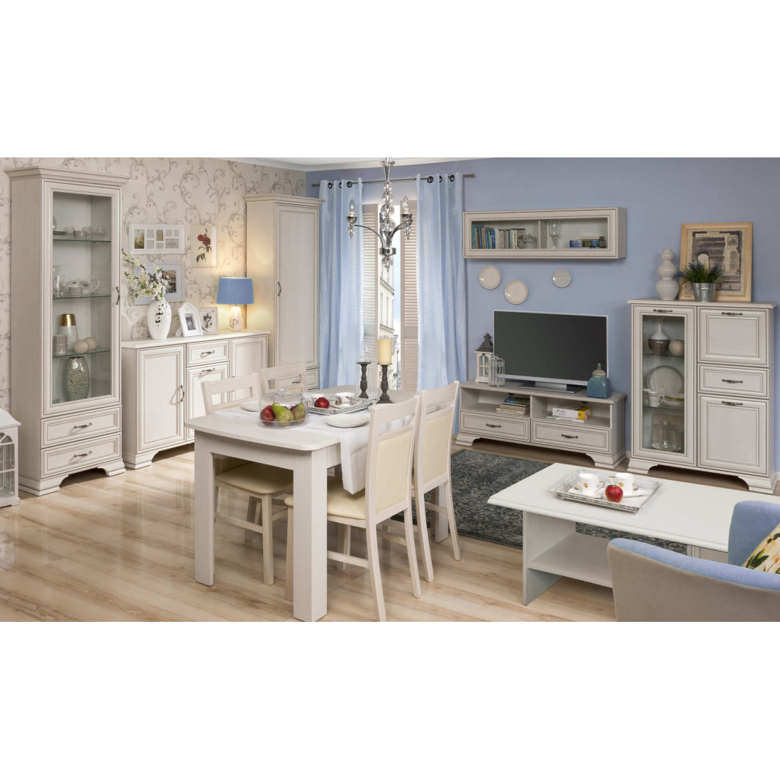 Гостиная Тиффани - это классика, которая всегда остается модной и стильной. Сочетание светлого оттенка с древесной структурой, нежных фасадов, обрамленных изящными планками с патиной и качественных металлических ручек создадут атмосферу тепла и уюта, а возможность использования подсветки делает эту коллекцию особенно привлекательной. Основное достоинство TIFFANY - эстетическая функциональность, которая роскошно дополнит различный по назначению интерьер.