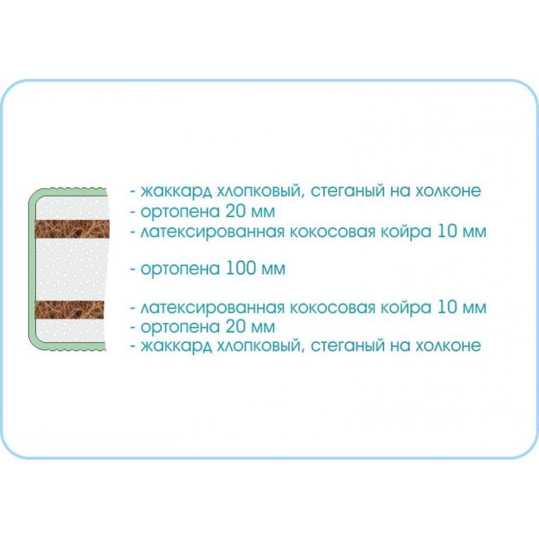 Наполнение: ортопена 20 мм с двух сторон, основа - ортопена высокой плотности 100 мм, кокос 10 мм с двух сторон.