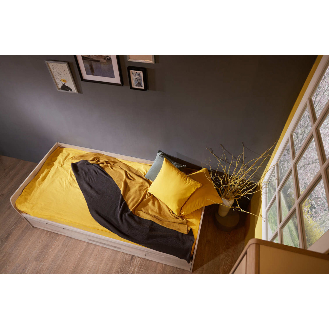 Кровать односпальная с ящиками Мале - обладательница лаконичного и свежего дизайна. Она является представителем коллекции «Мале». В этой коллекции особое внимание уделено внешнему виду и тактильным ощущениям от прикосновения к мебели, схожей с натуральным деревом по рисунку и шероховатости.