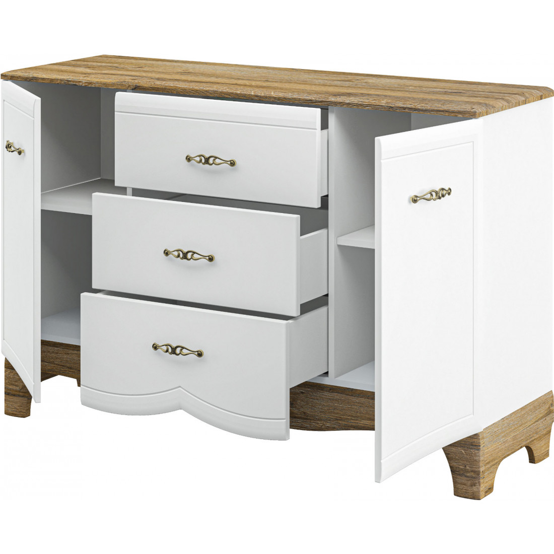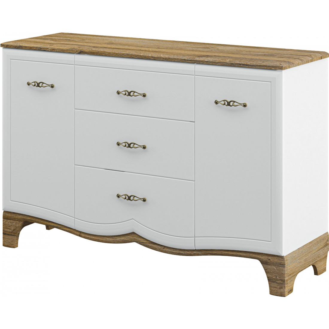 Широкая тумба в гостиную МН-041-10 серии Тиффани вместительна и практична. Благодаря зауженной глубине и глянцевой поверхности выбеленных фасадов, она не будет выглядеть громоздко в интерьере, поможет сохранить ощущения визуального простора в комнате. Контрастное сочетание белого глянца с темно-шоколадной столешницей и подстольем придает элегантно изящным классическим пропорциям современные черты. Купить широкую тумбу Тиффани (Мебель-Неман) в Меланго можно по недорогой цене.