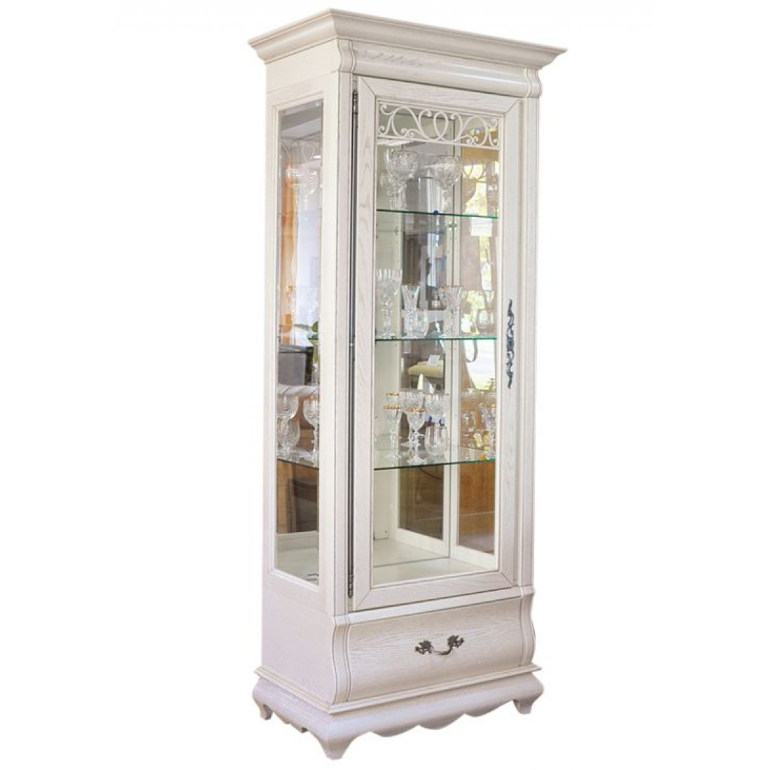 Классический шкаф с витринным стеклом из коллекции мебели для гостиной "Оскар" отличается высокими карнизами и плавными изгибами форм. Стекло витрины с фацетом и оригинальным растительным узором, выдвижной ящик на направляющих. Модель выполнена с использованием массива дуба и окрашена в оттенок "Белая эмаль с патиной". Дверца открывается влево.