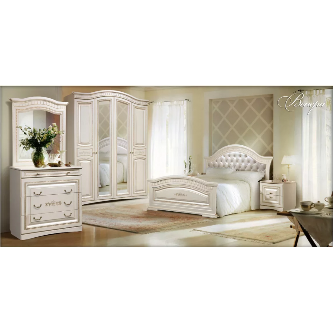 Спальня Венера 1- это во всех смыслах определяющая комната в доме. От ее вида, интерьера, обстановки зависят хорошее настроение, высокая работоспособность, полноценный отдых. Спальня – не только просторная кровать. Набор удобной, стильной, функциональной мебели может решить вопрос эргономичного распределения пространства в доме. Нежная романтика захлестнет Вас, как только Вы переступите порог этой чудесной спальни. Здесь царят воздушность и невесомость.