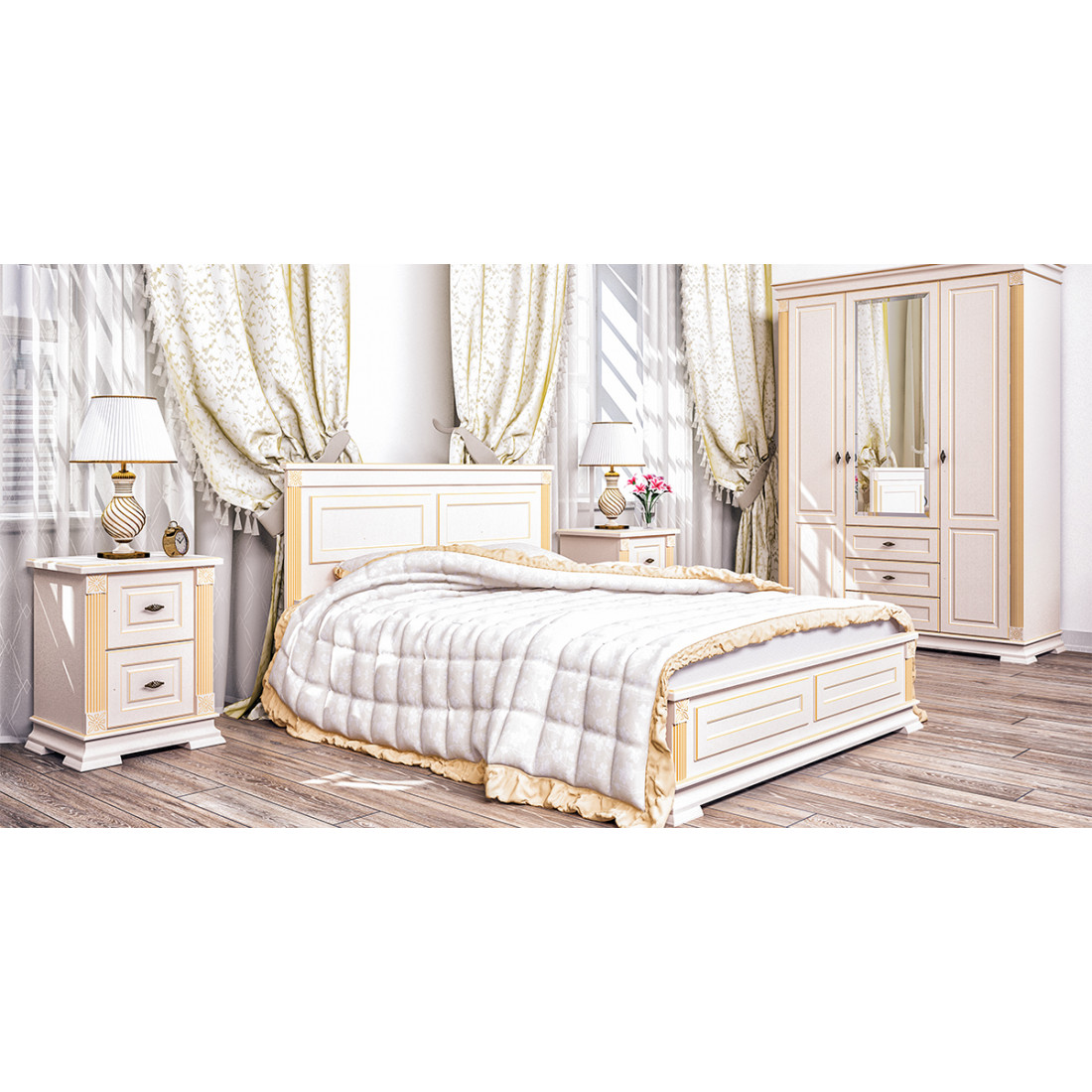 Тумба прикроватная МН-222-07 новой коллекции Афина от Мебель-Неман выполнена в цвете "крем с золотой патиной". Оснащена двумя выкатными ящиками.