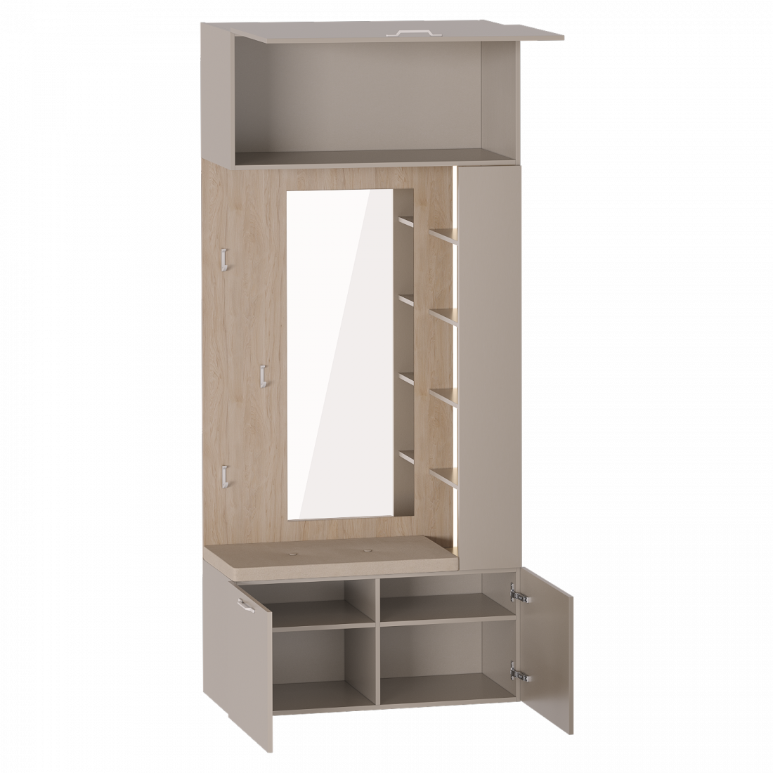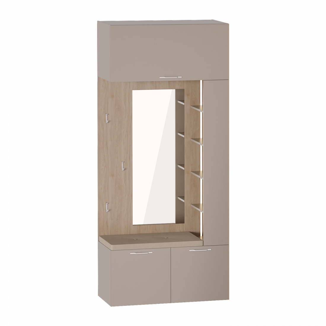 Модульная прихожая "ДЖЕРСИ", выполненная в современном стиле, придаст вашей прихожей красоту и функциональность. Модуль "Вешалка с зеркалом" выполнен из ЛДСП цвета Дуб натуральный светлый/Капучино.